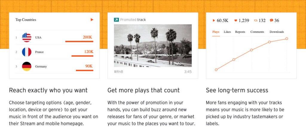 Both Spotify and SoundCloud have embraced the power of seamless, non-disruptive, integrated advertising. That’s a lot of buzzwords, but it boils down to this: adverts that enhance the user experience rather than interrupt it. SoundCloud Promote is an advertising platform that the aforementioned uses to sell platform-localised promotions to artists. Premium users can promote their tracks to target audiences on the platform so that they appear on the listener’s feed as recommended songs.