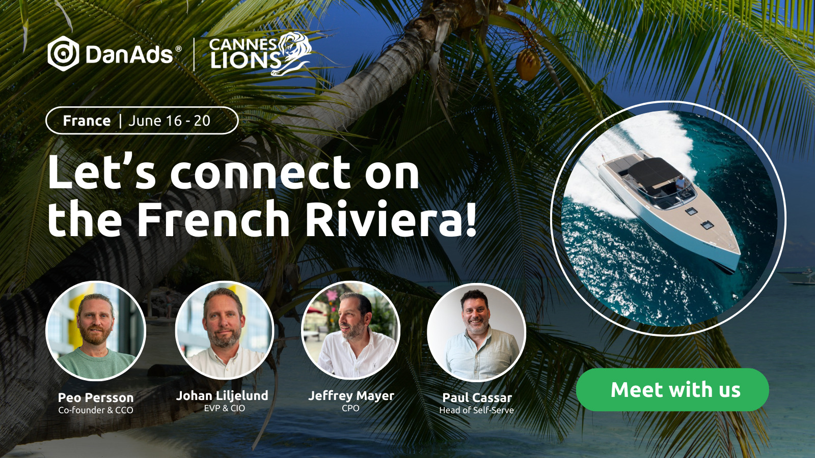 DanAds will be on the ground at Cannes Lions, and we’d love to connect! Reach out to Peo Persson, Johan Liljelund, Jeffrey Mayer, and Paul Cassar to discuss how our self-serve advertising solutions can empower your creative strategies and drive impactful results.